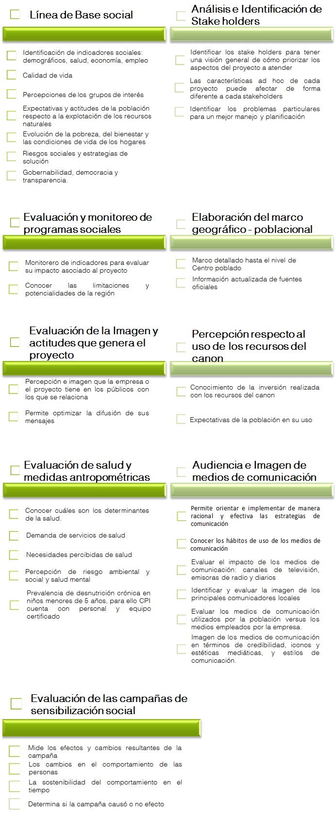 En los últimos años hemos venido trabajando con empresas extractivas en la evaluación social, lo que nos ha permitido adquirir experiencia en el desarrollo de metodologías y evaluación del contexto social de cada proyecto, a fin de sugerir la implementación de diferentes estrategias adaptadas a la realidad donde se desarrolla el proyecto.